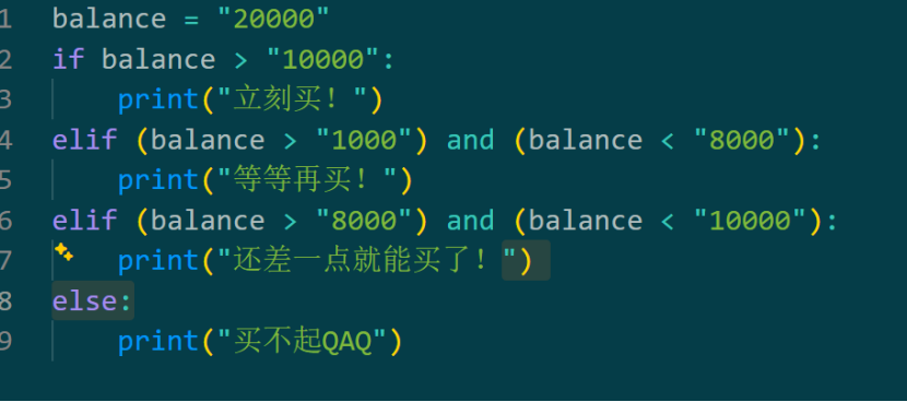 elif (balance > "8000") and (balance <= "10000"): # 条件3:8000 < 余额 ≤ 10000(不成立)