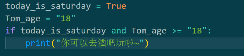 判断 "今天是否为周六,且 Tom 是否满 18 岁",若两个条件同时满足,则打印 "你可以去酒吧玩啦