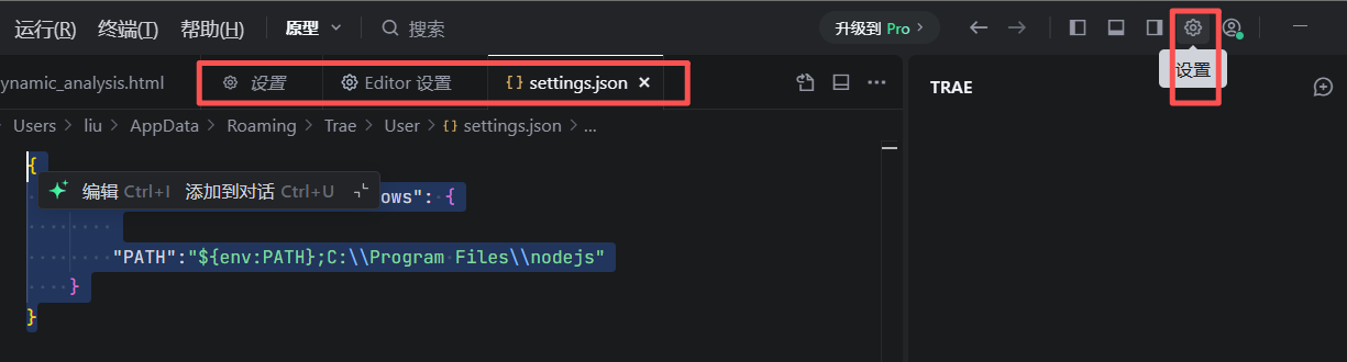 找到设置,通用,editor设置,settings.json环境变量修改