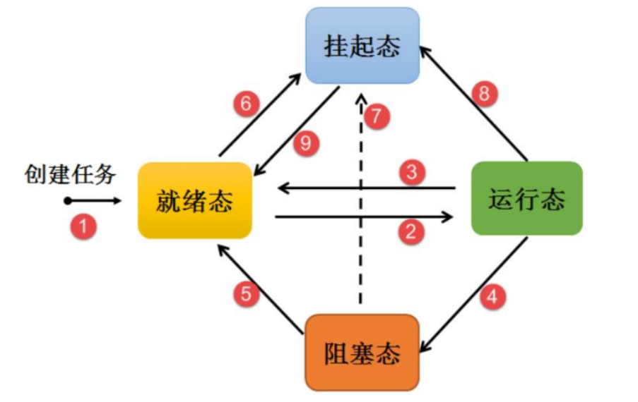 任务状态总共分为四种,就绪、运行、挂起、阻塞,每个任务都是在这四个状态中循环往复的。