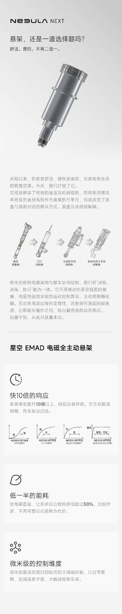 而 EMAD 电磁全主动悬架的逻辑是凭借微米级的运动控制算法,主动将颠簸化解。将"感知、决策、执行"融为一体。