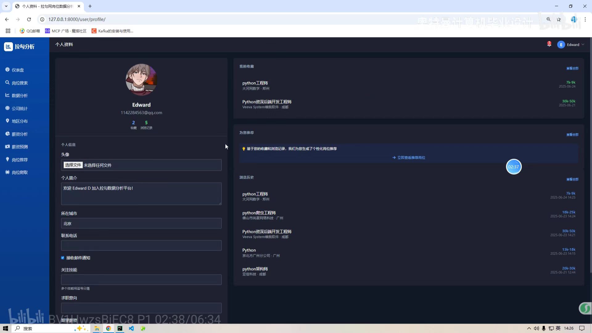 本项目依托多技术栈协同支撑,各核心技术各司其职、高效联动:Python作为系统核心开发语言,依托 Pandas、NumPy 实现数据的清洗、预处理与特征工程构建,基于 Scikit-learn 等库为机器学习算法、协同过滤推荐算法的建模、训练与优化提供核心开发环境,是数据处理与算法实现的基础;MySQL作为主流关系型数据库,承担招聘岗位、求职者简历、算法模型结果等所有结构化数据的安全存储、高效管理与多条件精准查询工作,凭借良好的事务性、数据一致性与可扩展性,为系统各功能模块提供稳定的数据支撑;Echarts作为基于 JavaScript 的开源可视化库,实现系统前端的动态可视化展示,支持多种图表类型的快速构建与灵活交互操作,将后端的数据分析结果、算法预测结论以直观、清晰的形式可视化呈现;同时搭配 Python Web 框架(Django)实现前后端数据交互与业务逻辑处理,结合 HTML/CSS 完成前端页面搭建与交互优化,保障系统的流畅运行与良好用户体验。