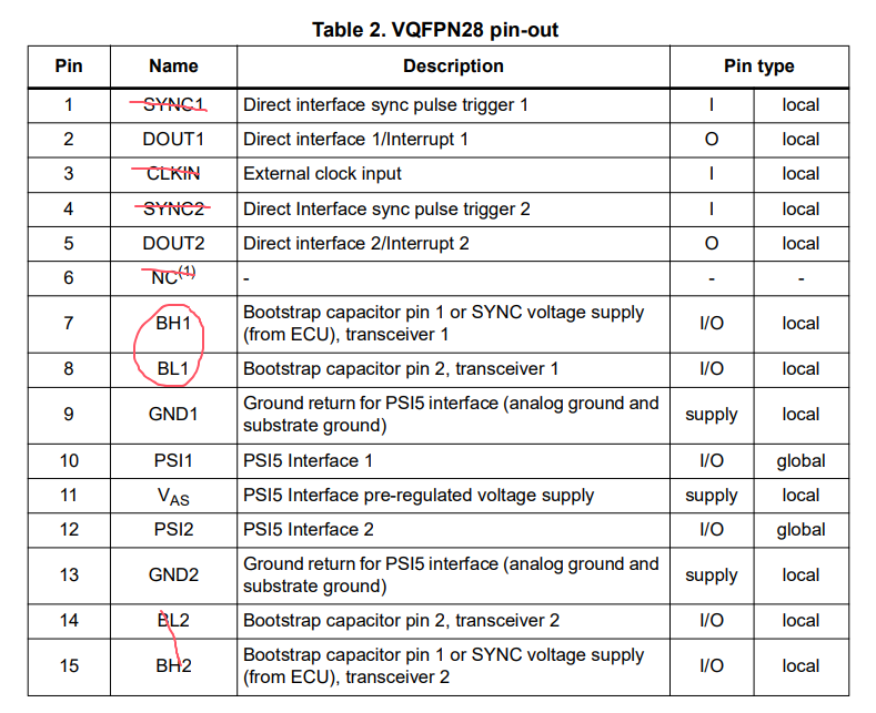 IC 内部的 PSI5 接口通过单独的输入引脚 Vas 供电。如果只需要异步模式,Vas 电压就足够为传感器供电。当需要同步模式时,需要高于 Vas 的电压来生成同步脉冲。该电压 Vsyncx 由每个通道的专用引导电路生成。