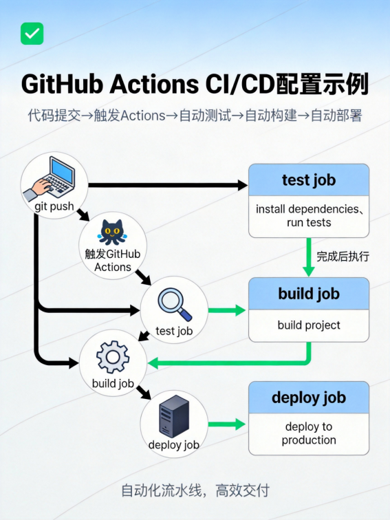 这个配置会在每次push到main/develop分支、或者创建PR到main分支时,自动触发:检出代码 → 安装依赖 → 运行测试 → 构建项目。如果任何一步失败,PR就不能合并。