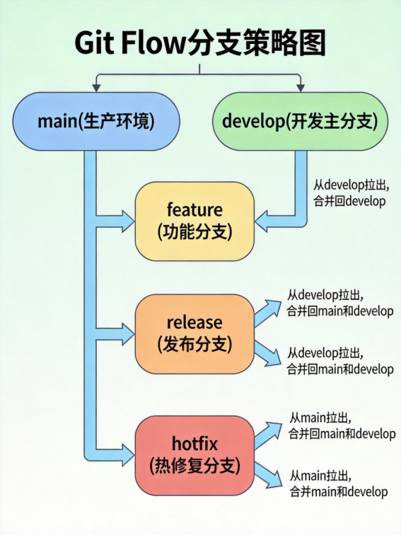 Git Flow 是最早也是系统化的分支策略,由Vincent Driessen在2010年提出。它有两个长期分支:master和develop。master分支存放生产环境代码,始终保持稳定可发布状态;develop分支是日常开发主分支,所有新功能先合并到develop。除此之外,还有三种短期分支:feature(功能分支)、release(发布分支)、hotfix(热修复分支)。