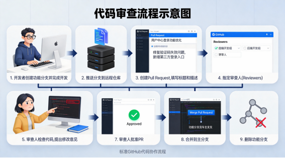 GitHub Flow的核心理念是:main分支永远是可部署的。所有提交必须通过代码审查和CI测试才能合并到main。这保证了代码质量和稳定性。