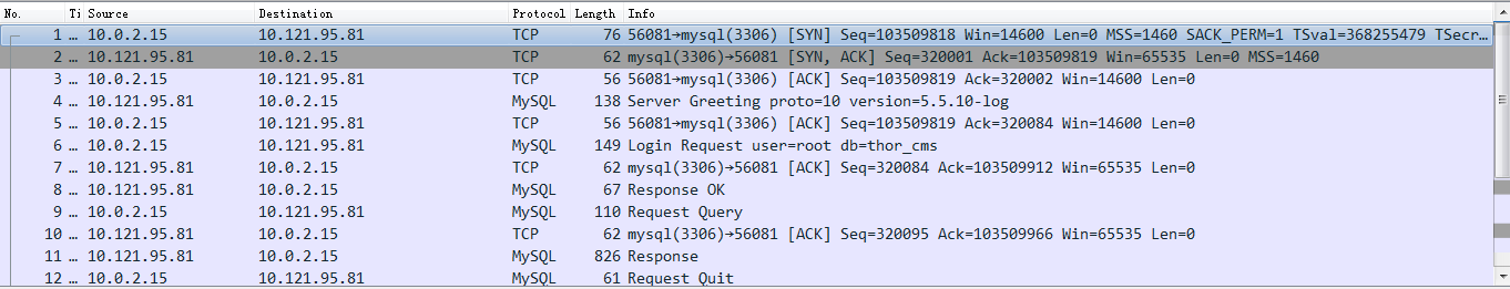 可以看到整个过程:3次握手--Login Request--Request Query--Request Quit