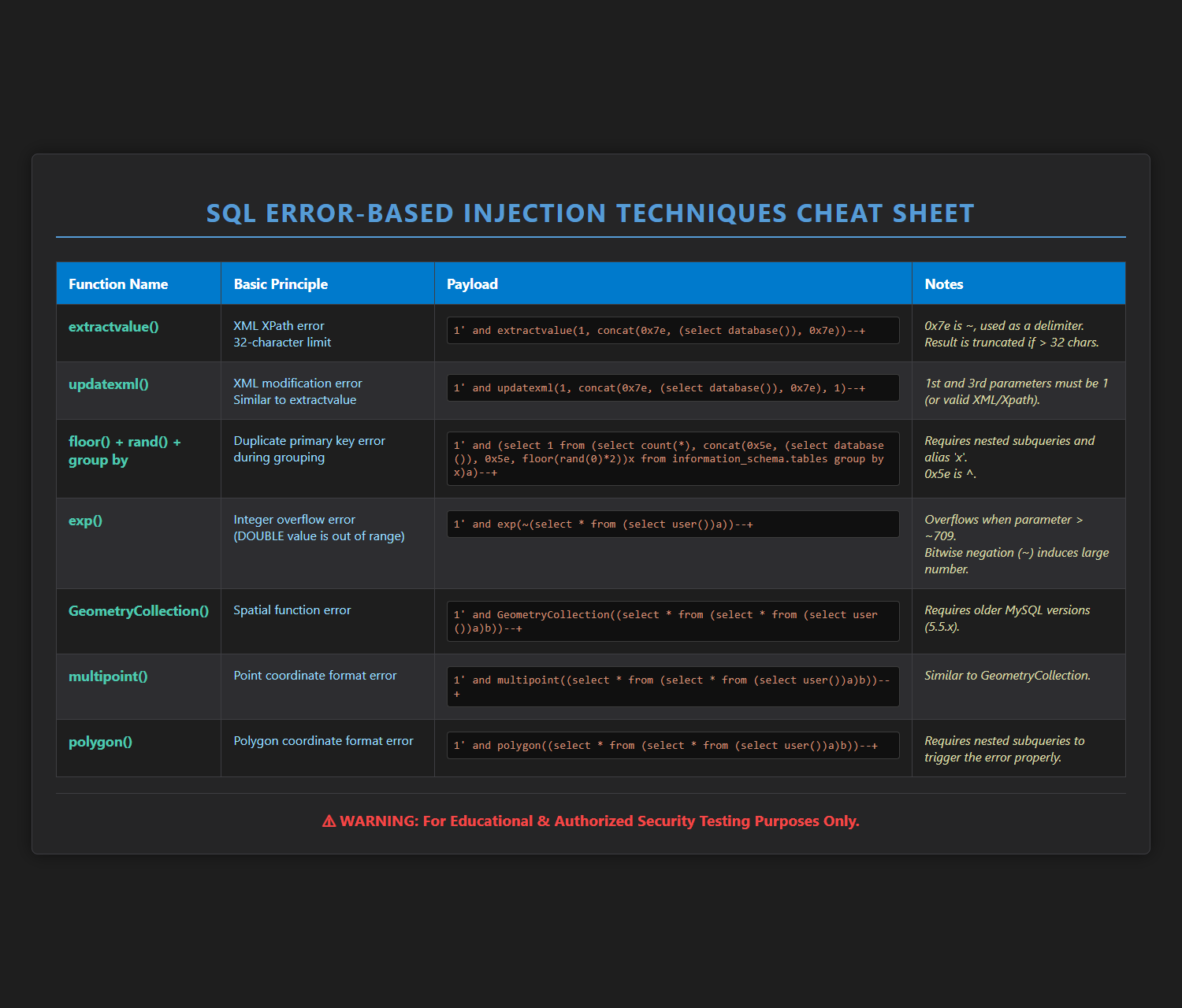 下表汇总了七大经典报错注入函数的原理、Payload模板及实战说明。