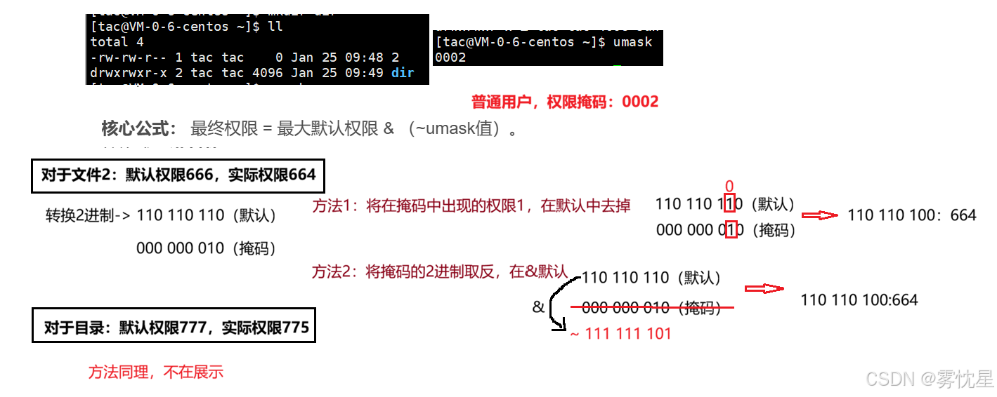 核心公式: 最终权限 = 最大默认权限 & (~umask值)。(要转换成二进制数)