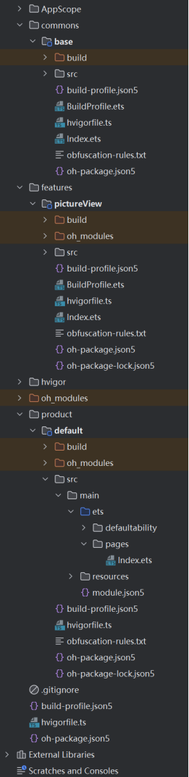 图片查看器采用HammonyOS"一多"所推荐的三层工程结构,整个应用结构分为common、features、product三层。工程结构如图所示: