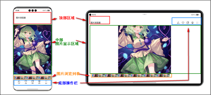 从图片查看器在各设备上的UX设计图中,可以观察到不同尺寸下的页面设计有较多相似的地方。各组成部分在不同设备下的显示位置如图所示: