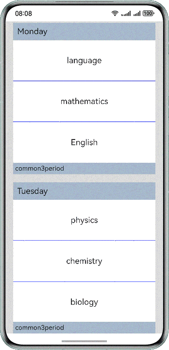 ListItem组件包裹文本,设置宽度、高度、字体大小、文本对齐和背景颜色。 - 为每个课程项设置分割线,使用蓝色并设置宽度。