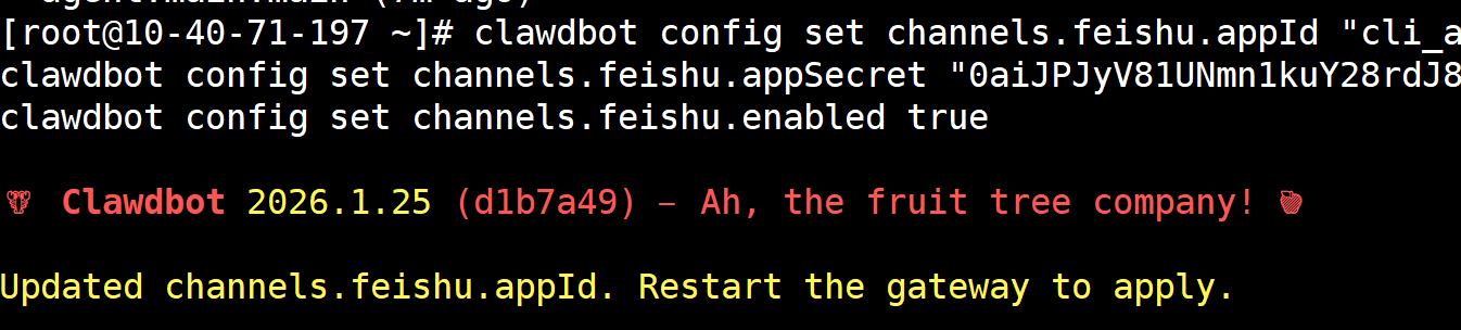 clawdbot config set channels.feishu.appId "cli_xxxxx"clawdbot config set channels.feishu.appSecret "your_app_secret"clawdbot config set channels.feishu.enabled true
