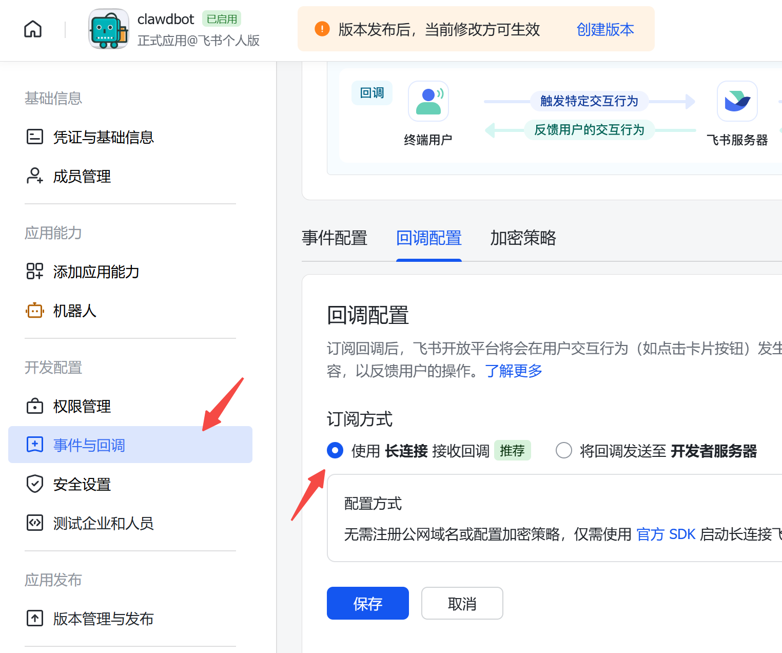 在 事件订阅 / 回调配置 中,勾线使用长连接接受回调: