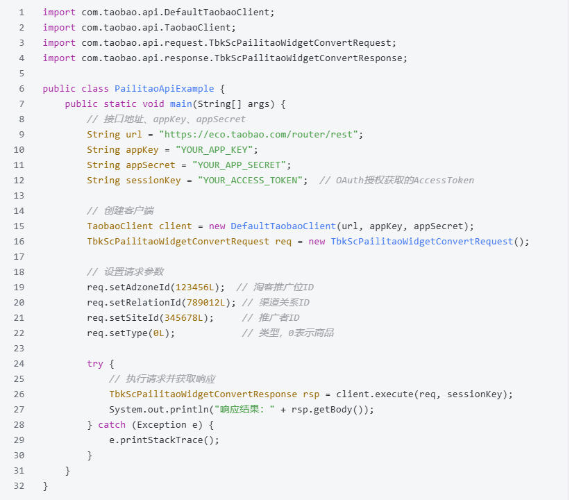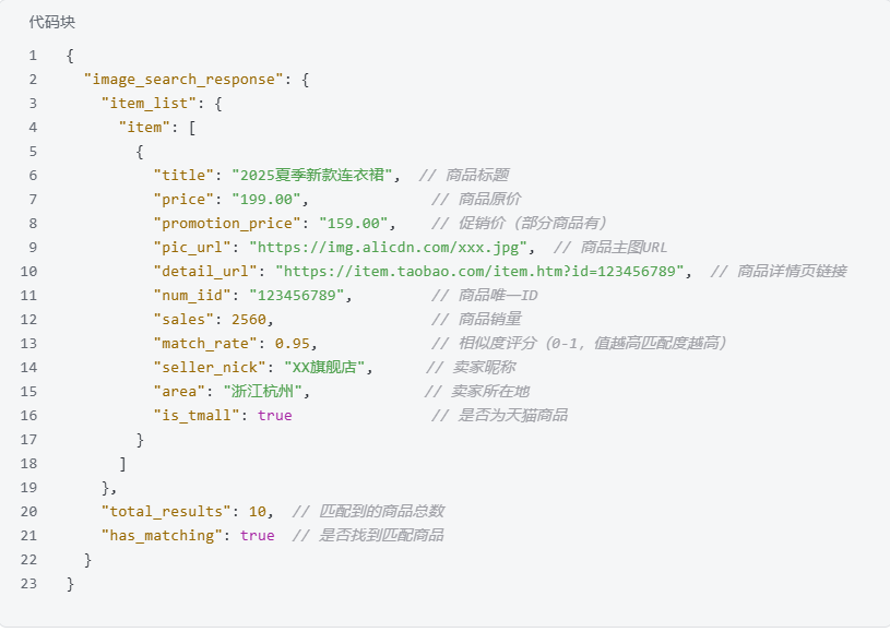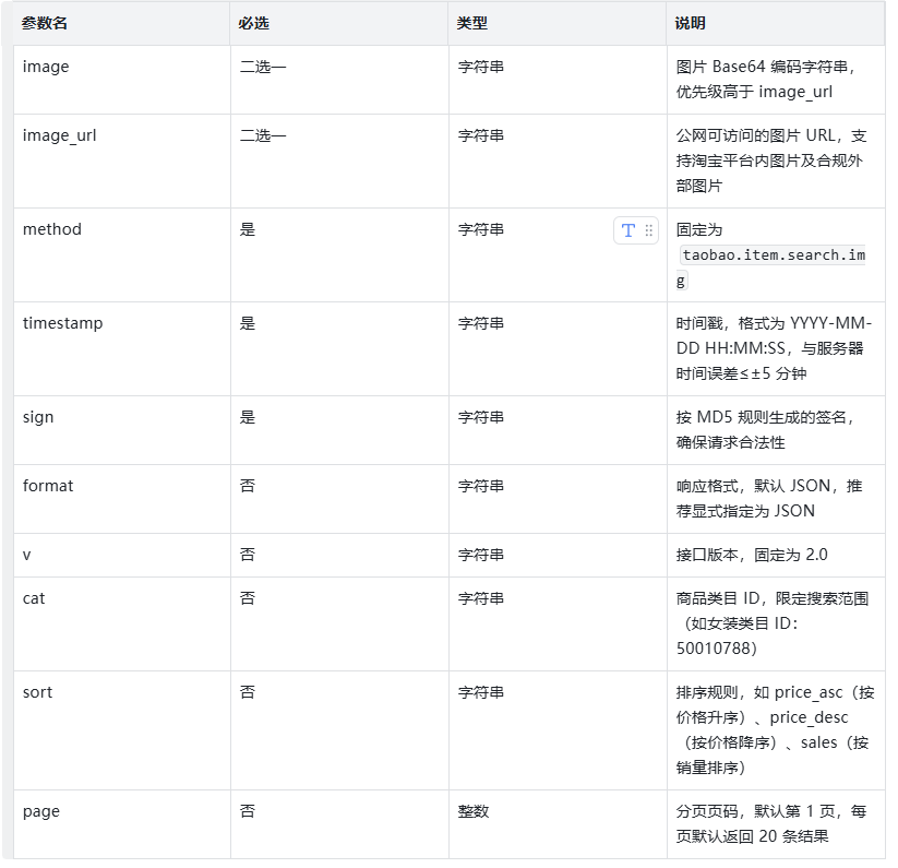 核心接口为 taobao.item.search.img,部分场景也可使用淘客相关拍立淘接口(如 TbkScPailitaoWidgetConvertRequest),均采用 JSON 格式响应数据,确保跨平台解析兼容性。