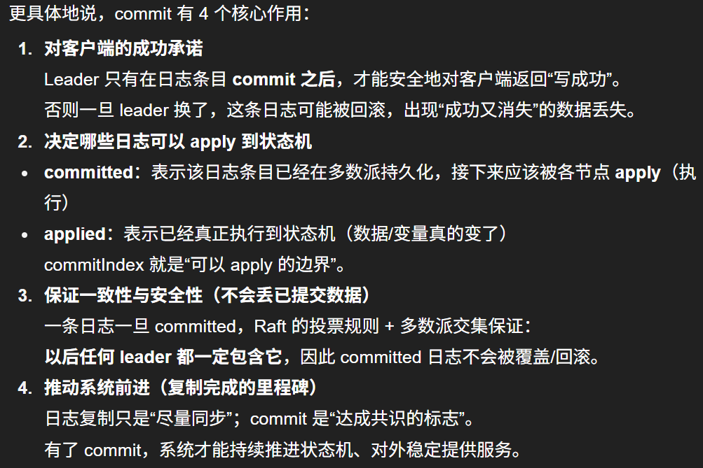 当 leader 得知某条日志项被成功复制到集群的大多数节点后,就可以进行commit,表明该日志项可以被apply生效到状态机,committed(已提交)日志项一定最终会被状态机 apply。