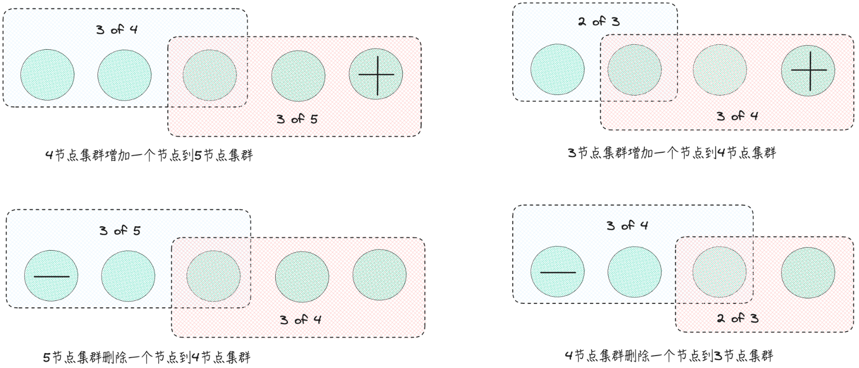 而集群节点的变更最主要的就是会影响到多数派,比如在一个三个节点的集群中原本只要2个节点就可以达到多数派,假设现在往集群新增两个节点,则需要三个节点才能达到多数派。