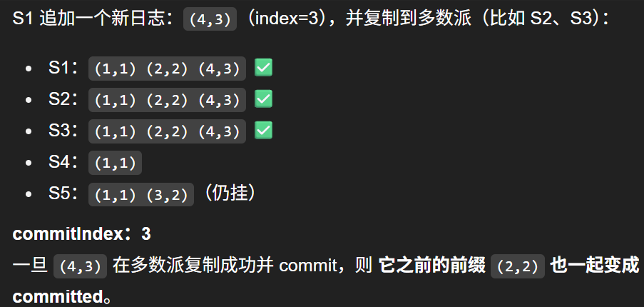 阶段c:S5宕机,S1恢复,S1重新当选term为4的leader,继续将日志项(2,2)复制给了S3,已经满足大多数节点(S1,S2,S3),于是S1将该日志项commit