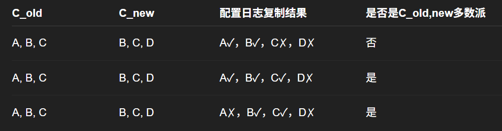 C_old,new的大多数节点:是指C_old中的大多数和C_new中的大多数,如下表所示,第一行因为C、D节点还没有被复制到日志,导致C_new的多数派不能达成,所以该日志不能被commit