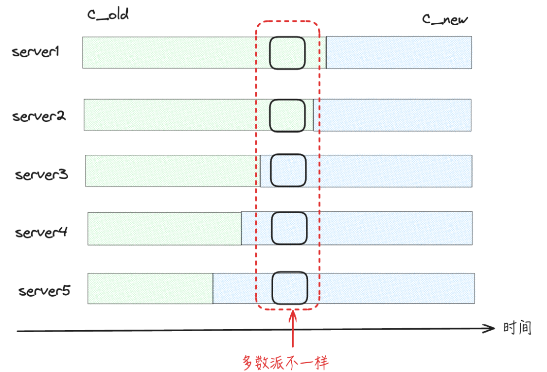 在raft集群中,同样是由Leader节点负责同步集群的配置信息,当集群中出现节点变更,几乎不可能保证所有节点同时进行配置的变更,由于网络延后等因素导致一部分节点配置已变更,另一部分没有变更在所难免,所以就会导致集群中部分节点使用的新的配置信息C_new,而有的节点使用老的配置信息C_old。