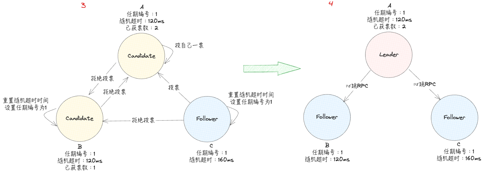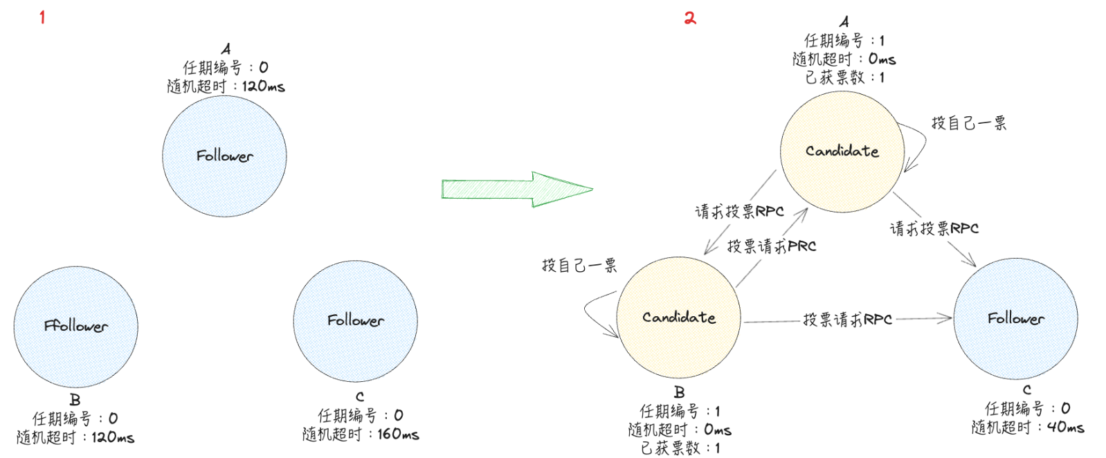 Follower等待Leader的心跳超时后,会推举自己为Candidate发起投票,此时会将当前任期编号加1。比如当前该Follower保存的任期为1,在推举自己为候选人激票时,会将任期编号增加到2