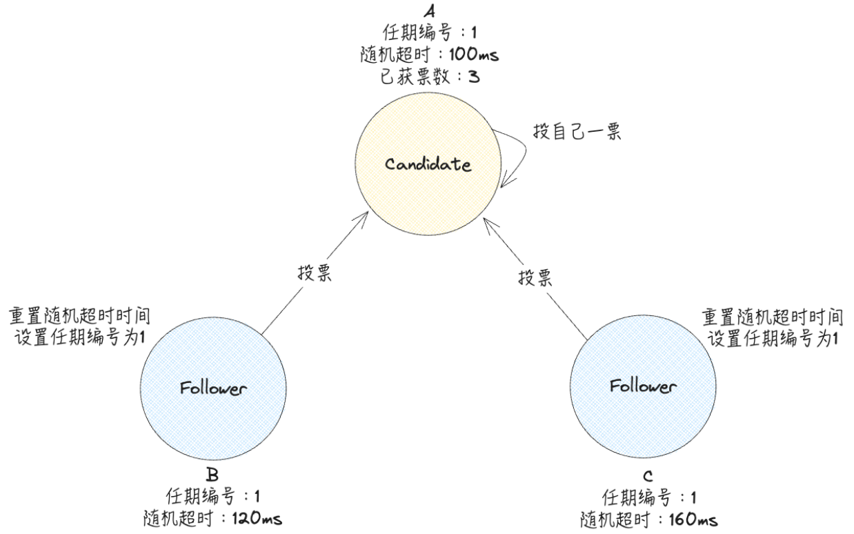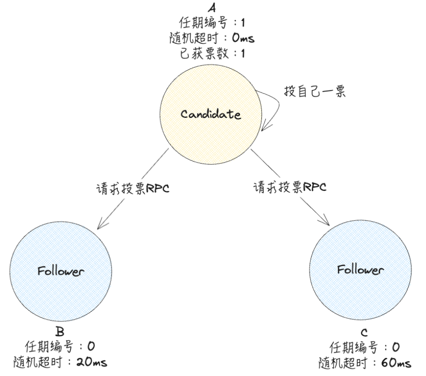 由于节点A的随机超时的时间是设置的最小的,为100ms,所以在A在100ms后倒计时结束被唤醒,成为Candidate,并为自己发起投票,此时将自己的任期编号加1,变为1。先投自己一票,然后向其他的Follower发起投票RPC请求