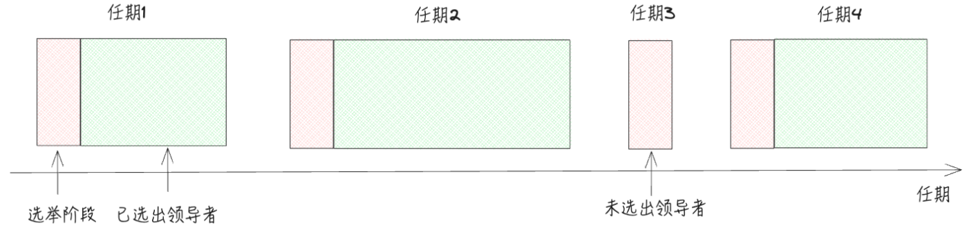 任期包含两个阶段:1. 选举阶段 2. 已选举出Leader的阶段。同上面所说,任期也可能只包含选举阶段,没有Leader,比如图中的任期3,这种情况下,会立即进入到下一个任期,开始新的选举。