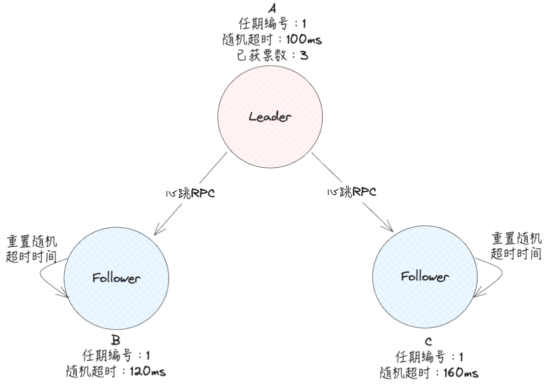 初始时,每个节点的角色都是 Follower,任期Term为 0(假设任期编号从0开始),每个节点都设置了一个随机超时时间(节点A:100ms,节点B:120ms,节点C:160ms),如下图: