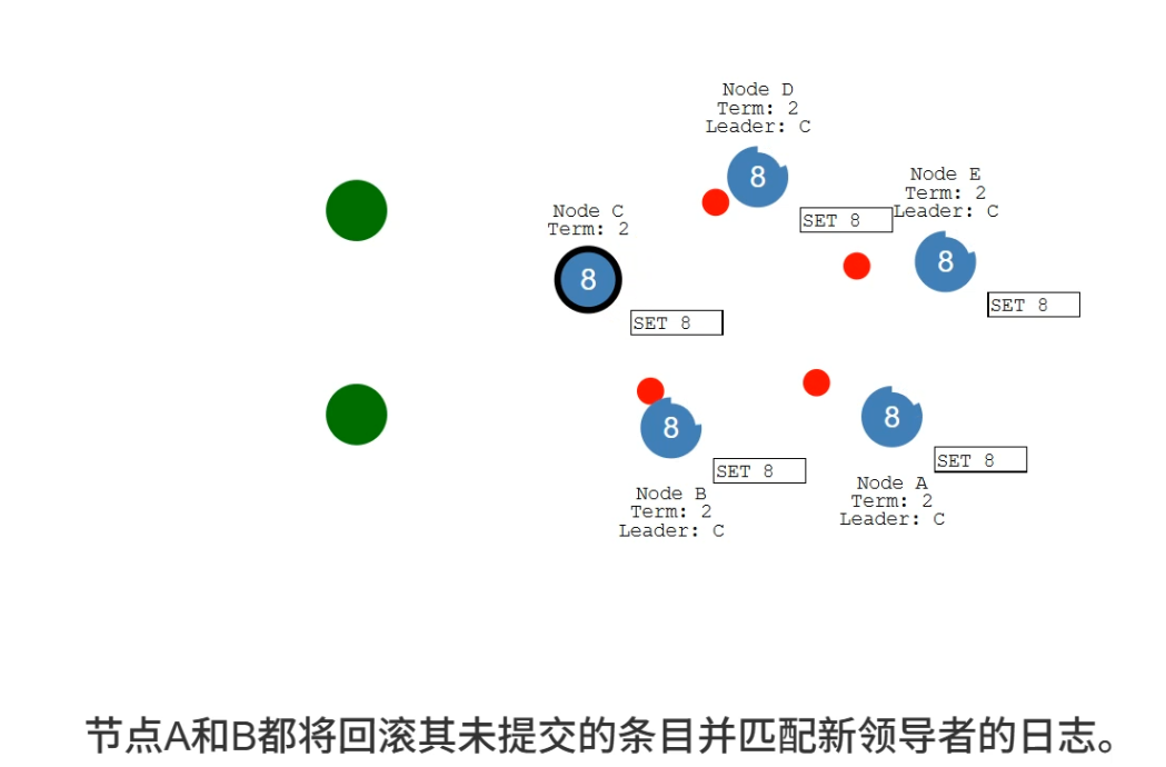 如果一个Leader或者是Candidate发现自己的任期编号比其他节点小,该节点会立即退回到Follower,假设由于网络分区错误,集群中出现了两个Leader,LeaderA任期编号为4,LeaderB任期编号为5,当网络分区错误恢复后,LeaderA收到了来自LeaderB的心跳信息,LeaderA将退为Follower,接收LeaderB成为Leader