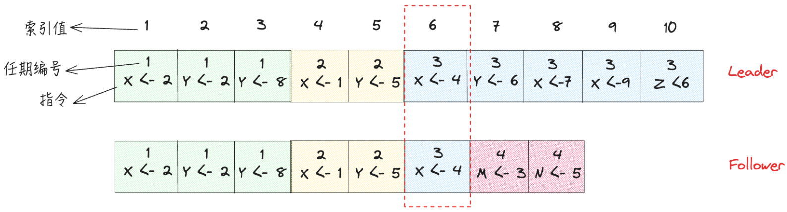 Leader收到Follower的失败响应后,将日志项的索引值-1,接着发送索引值为9的日志项并且携带prevLogIndex(8)和prevLogTerm(3)给Follower,Follower发现自己索引值为8的日志项中任期为4,指令为N<-5,和Leader发过来的日志项不一样,再次拒绝更新,向Leader响应失败