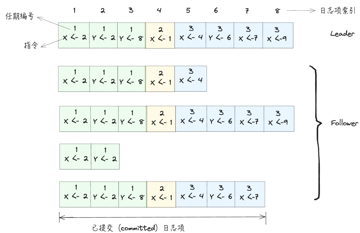 在加了这个条件之后,再结合上本身Candidate就必须赢得集群大多数节点的投票才会成为Leader,同时一条日志只有复制到了大多数节点才能被commit,所以Leader就一定拥有所有committed日志。也就是说:Follower 不可能比 leader 多出一些 committed 日志