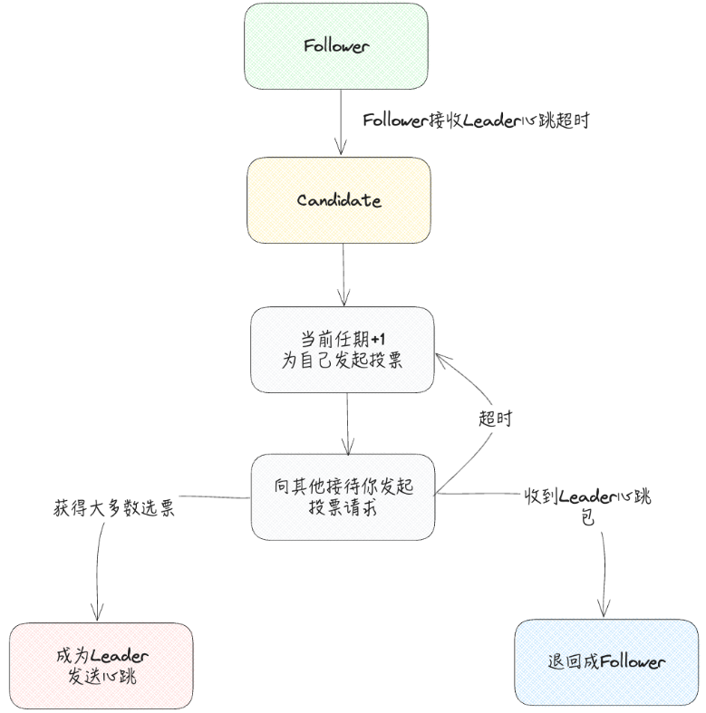 b. 当 Follower 长时间未接收到 Leader 的心跳信号时,会认为 Leader 可能已经失效,从而将自己状态转换为 Candidate 并发起选举 。Candidate 向其他节点请求选票,若获得超过半数节点的投票,就会成为新的 Leader