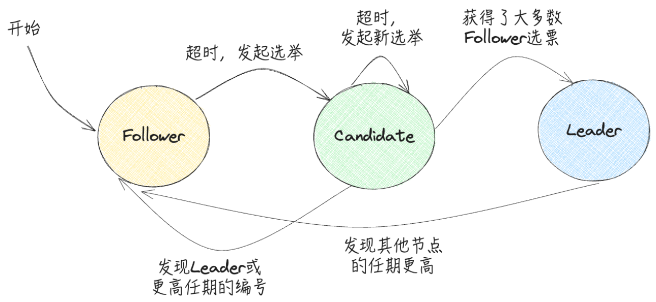在一个Raft集群中,每个节点有以下三种状态,一般也称这三种状态的节点为Raft集群的三种角色