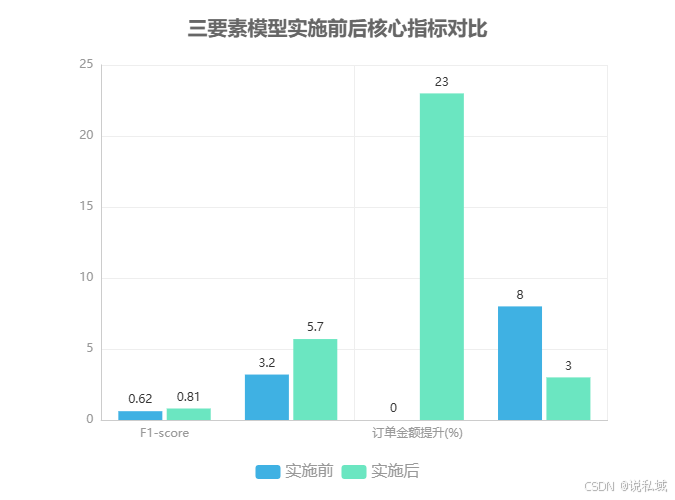 优化效果对比:实施三要素模型后,推荐系统核心指标呈现显著改善。其中,推荐列表与用户兴趣的匹配度(F1-score)从0.62提升至0.81,用户平均浏览商品数量从3.2件增加至5.7件,推荐引导的平均订单金额提升23%。系统稳定性方面,模型预测准确率波动幅度从±8%收窄至±3%,有效支撑了大促期间的流量峰值处理需求。