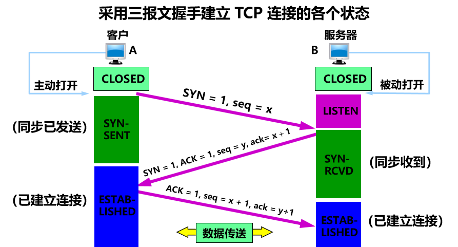 - 第三次握手:A 收到此报文段后向 B 给出确认,其 ACK = 1,确认号 ack = y + 1。A 的 TCP 通知上层应用进程,连接已经建立。B 的 TCP 收到主机 A 的确认后,也通知其上层应用进程:TCP 连接已经建立。双方可以开始数据传送