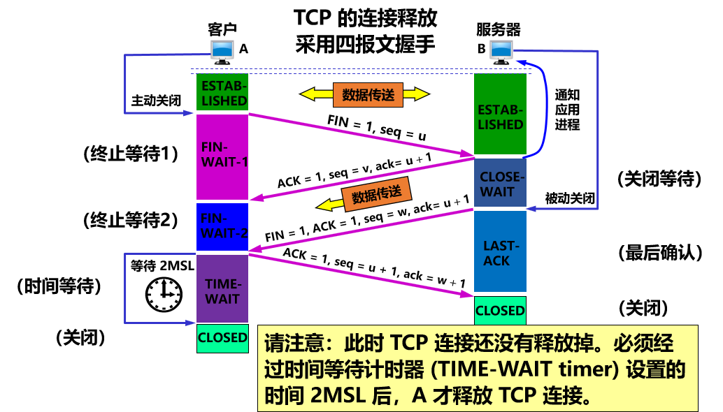 - 第四次挥手:A 收到连接释放报文段后,必须发出确认。 ACK=1,确认号 ack=w+1,自己的序号 seq = u + 1