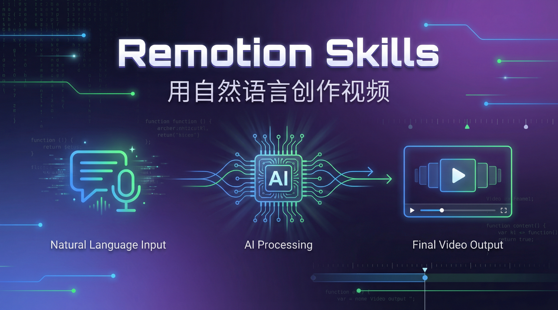 Remotion Skills 是一个 AI 技能工具包,允许 AI 代理(如 Claude Code、Codex、Cursor 等)直接理解用户的自然语言命令,并自动生成专业的视频内容。它建立在 Remotion 框架之上------Remotion 本身是一个基于 React 的视频创作框架,让开发者可以用代码创建视频。