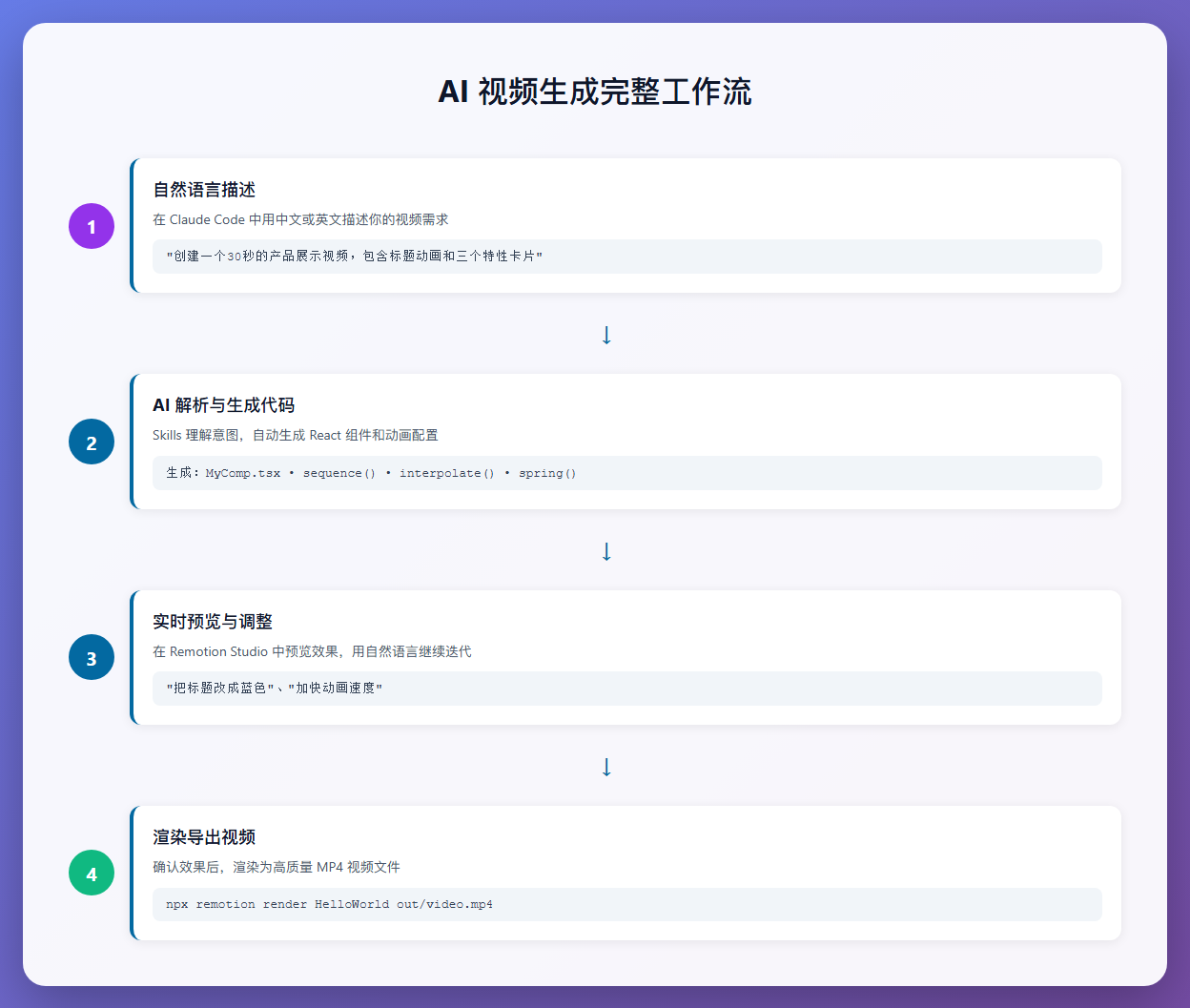 - Skills 方式:你说"创建一个产品展示视频",AI 自动生成所有代码