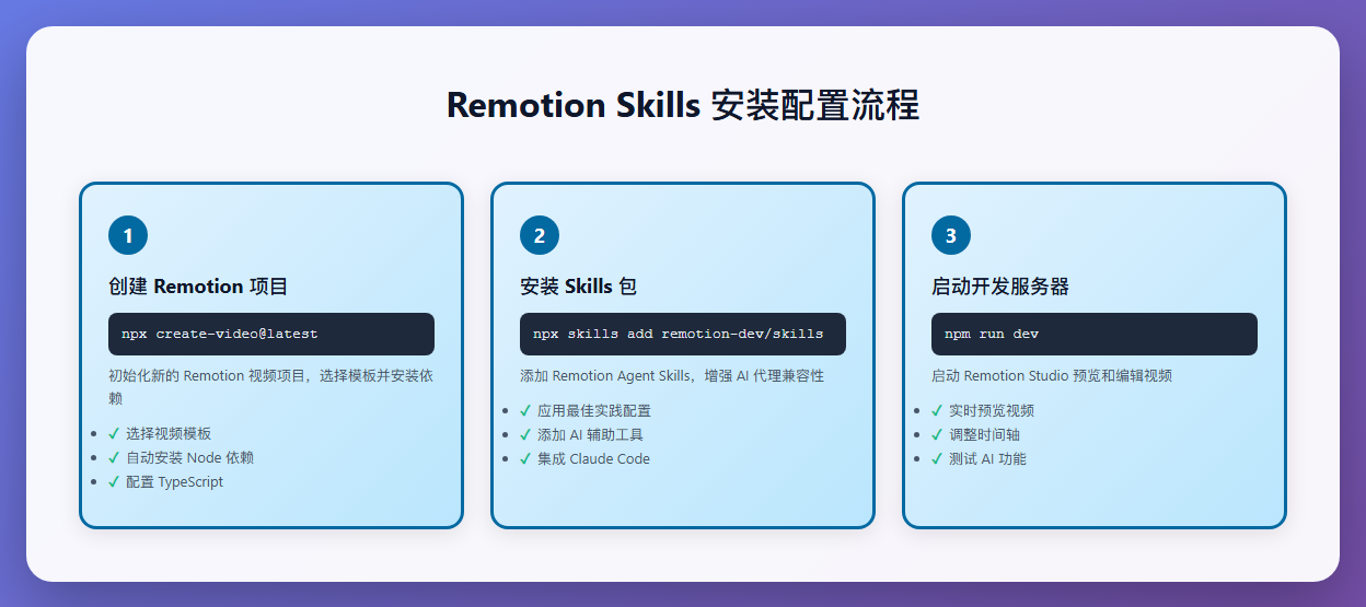 - 🔧 快速搭建开发环境 - 从零开始安装配置 Remotion + Skills + Claude Code 完整工作流