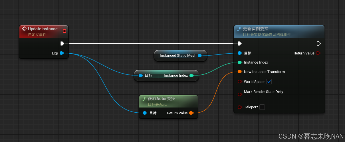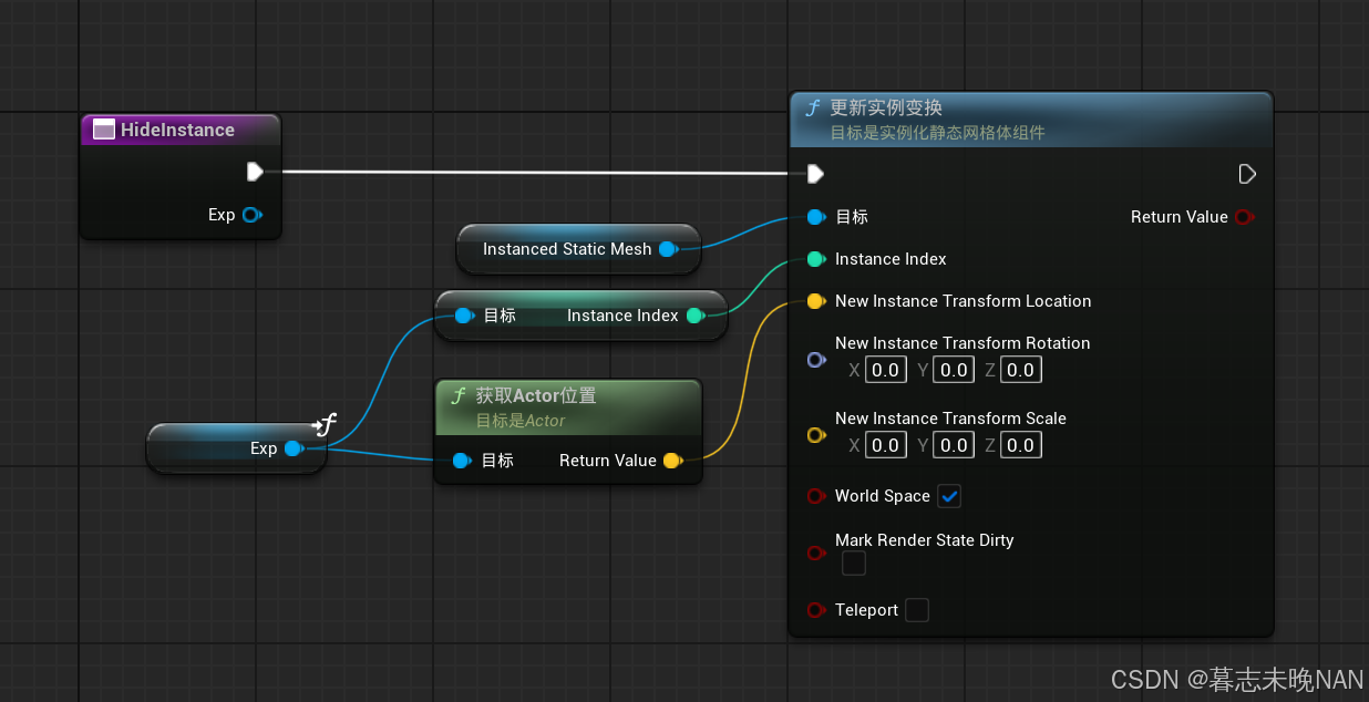 然后是更新,这里小伙伴们就要问了,为什么还有一个数组,这个数组的作用就是用于记录当前Actor实例的索引,静态网格体组件的索引和数组的一致,所以我们就可以通过单独创建一个数组来维护需要渲染的实例的索引,有些需要更新位置,我们就可以通过索引找到对应网格体实例进行更新。