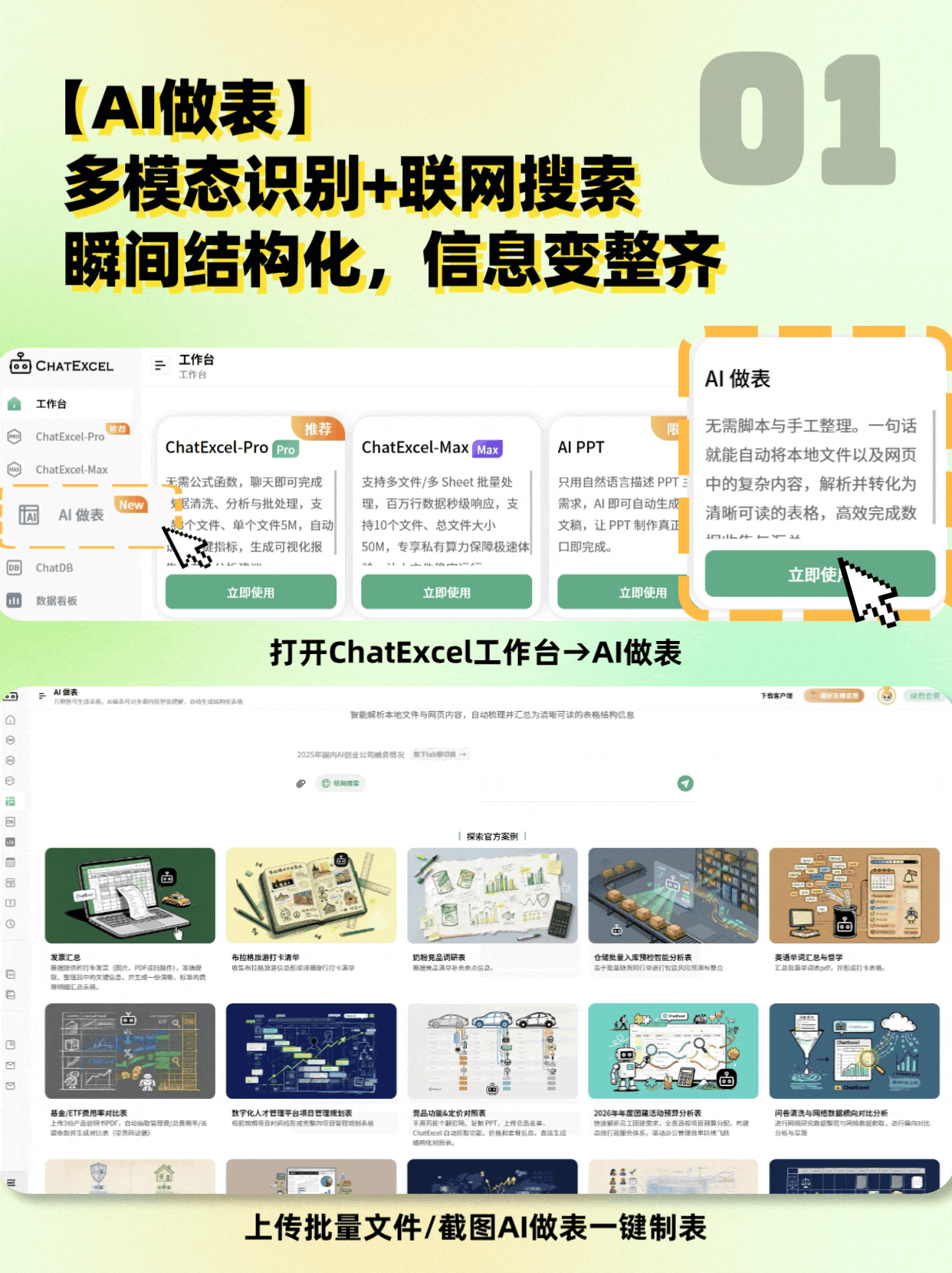 拒绝手动输入!无论是乱七八糟的文件还是截图,丢给ChatExcel就能一键变成整齐的表格。它能识别多模态内容,信息瞬间结构化,强迫症看了都直呼舒服!🚀