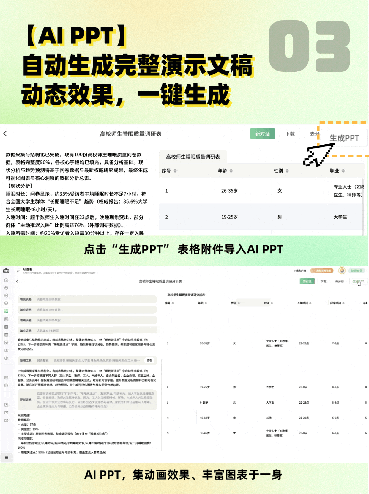 你可以使用单个功能体会AI做表、Excel分析、PPT自动生成,也可以通过几个环节丝滑完成从杂乱信息到精美PPT的转变,简直是打工人的救星!🧨