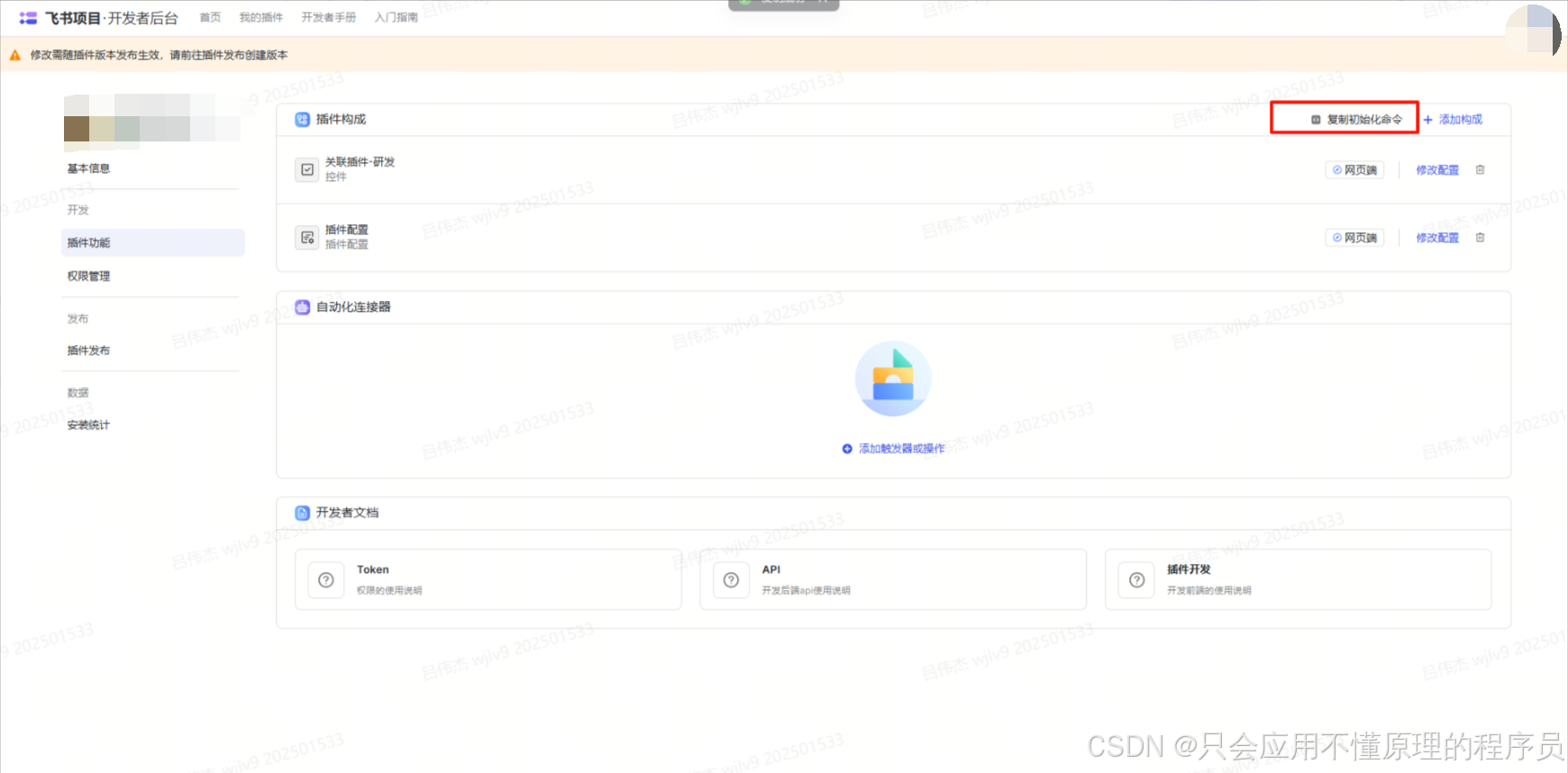 拉取代码 :在 飞书开放平台后台 中,进入对应应用详情,点击 "复制初始化命令" 。