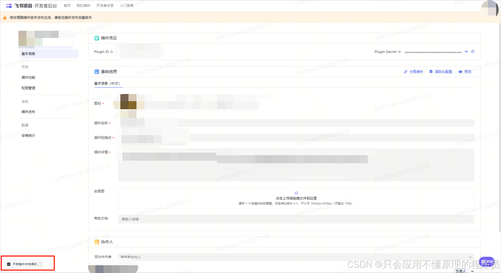 开启调试 :在 飞书开放平台后台 中,进入对应应用详情,开启 "本地调试" 模式。