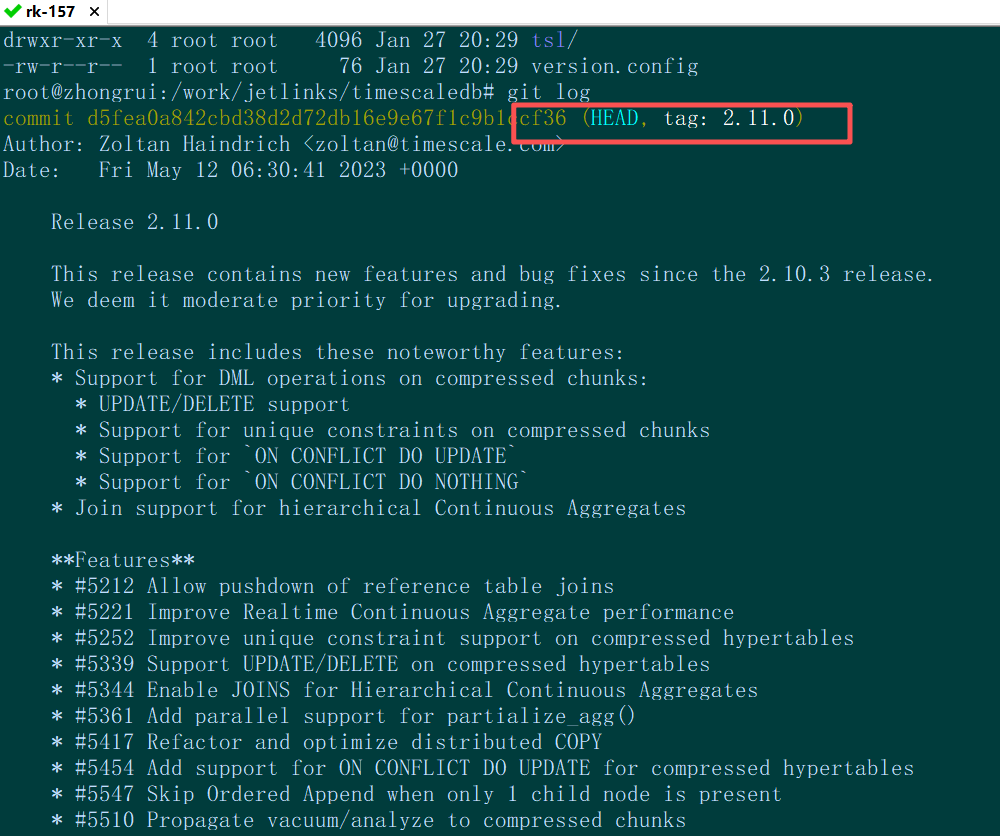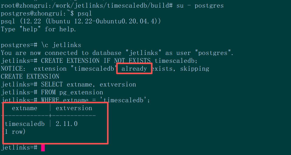 shell\c jetlinks CREATE EXTENSION IF NOT EXISTS timescaledb;textroot@zhongrui:/work/jetlinks/timescaledb/build# su - postgres postgres@zhongrui:~$ psql psql (12.22 (Ubuntu 12.22-0ubuntu0.20.04.4)) Type "help" for help. postgres=# \c jetlinks You are now connected to database "jetlinks" as user "postgres". jetlinks=# CREATE EXTENSION IF NOT EXISTS timescaledb; NOTICE: extension "timescaledb" already exists, skipping CREATE EXTENSION jetlinks=# SELECT extname, extversion jetlinks-# FROM pg_extension jetlinks-# WHERE extname = 'timescaledb'; extname | extversion -------------+------------ timescaledb | 2.11.0 (1 row) jetlinks=#