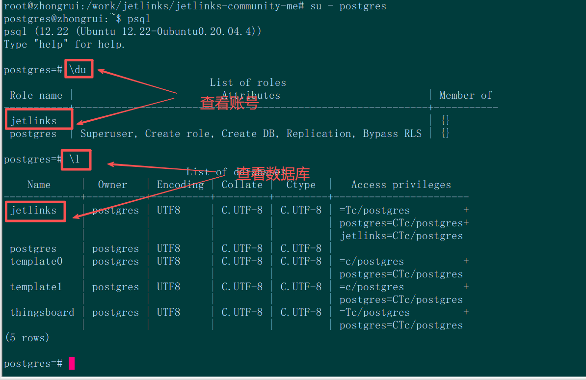 textroot@zhongrui:/work/jetlinks/jetlinks-community-me# su - postgres postgres@zhongrui:~$ psql psql (12.22 (Ubuntu 12.22-0ubuntu0.20.04.4)) Type "help" for help. postgres=# \du List of roles Role name | Attributes | Member of -----------+------------------------------------------------------------+----------- jetlinks | | {} postgres | Superuser, Create role, Create DB, Replication, Bypass RLS | {} postgres=# \l List of databases Name | Owner | Encoding | Collate | Ctype | Access privileges -------------+----------+----------+---------+---------+----------------------- jetlinks | postgres | UTF8 | C.UTF-8 | C.UTF-8 | =Tc/postgres + | | | | | postgres=CTc/postgres+ | | | | | jetlinks=CTc/postgres postgres | postgres | UTF8 | C.UTF-8 | C.UTF-8 | template0 | postgres | UTF8 | C.UTF-8 | C.UTF-8 | =c/postgres + | | | | | postgres=CTc/postgres template1 | postgres | UTF8 | C.UTF-8 | C.UTF-8 | =c/postgres + | | | | | postgres=CTc/postgres thingsboard | postgres | UTF8 | C.UTF-8 | C.UTF-8 | =Tc/postgres + | | | | | postgres=CTc/postgres (5 rows) postgres=#