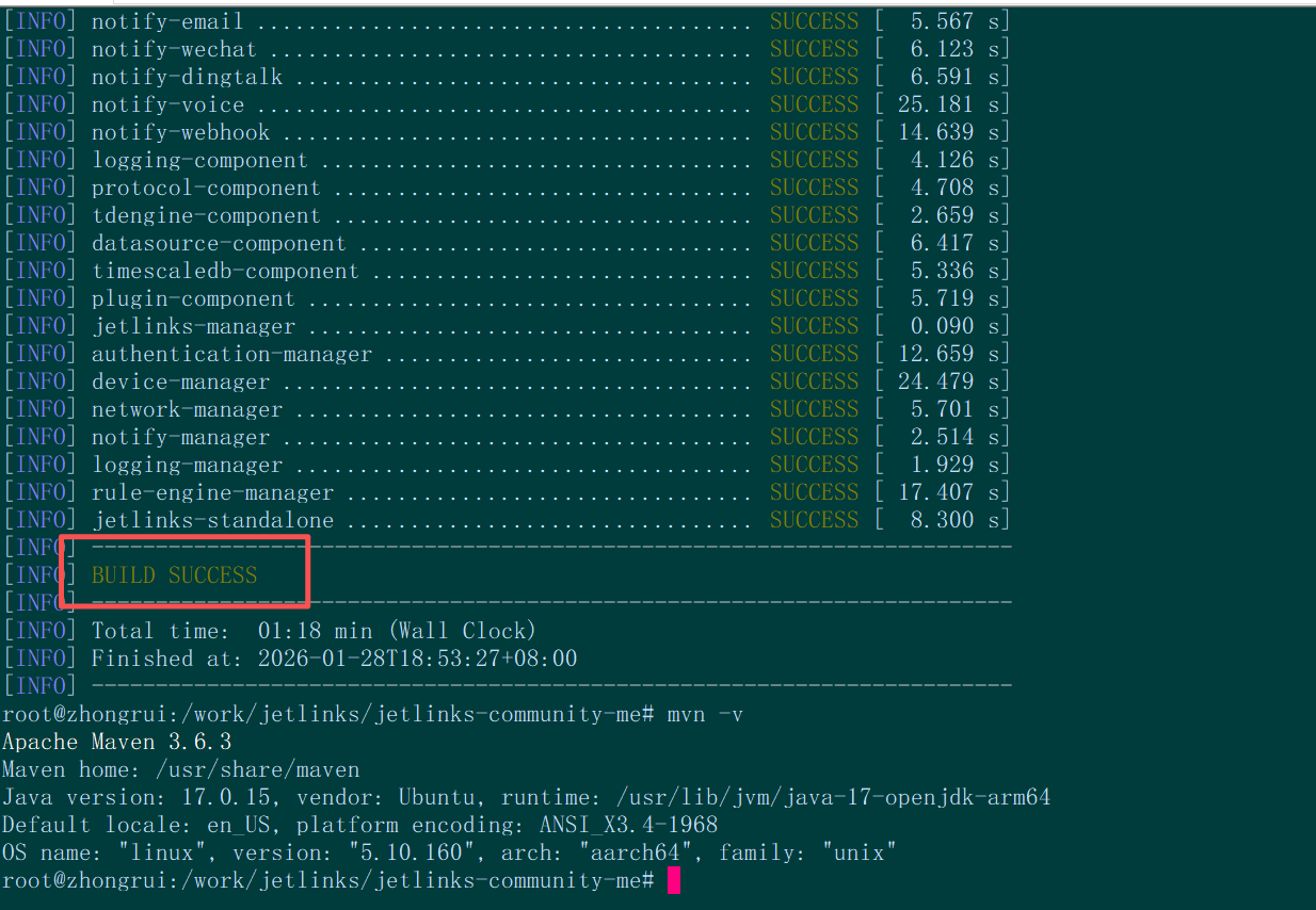 textroot@zhongrui:/work/jetlinks/jetlinks-community-me# mvn -v Apache Maven 3.6.3 Maven home: /usr/share/maven Java version: 17.0.15, vendor: Ubuntu, runtime: /usr/lib/jvm/java-17-openjdk-arm64 Default locale: en_US, platform encoding: ANSI_X3.4-1968 OS name: "linux", version: "5.10.160", arch: "aarch64", family: "unix" root@zhongrui:/work/jetlinks/jetlinks-community-me#