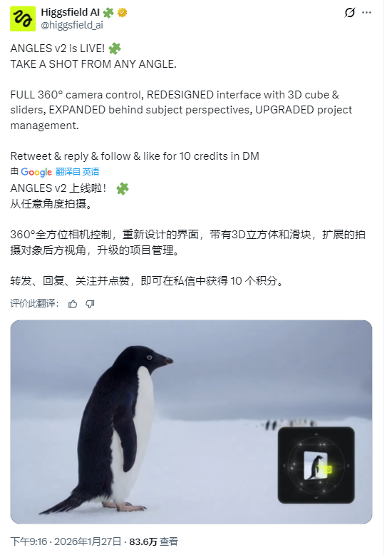 Higgsfield AI正式发布ANGLES v2,这一重大更新为创作者带来了前所未有的镜头控制力。通过创新的 "单场景 → 9帧多角度" 工作流,用户现可实现完整的360°相机视角控制,在数秒内快速探索不同的镜头语言、构图与景深,大幅提升分镜设计的效率与精准度。