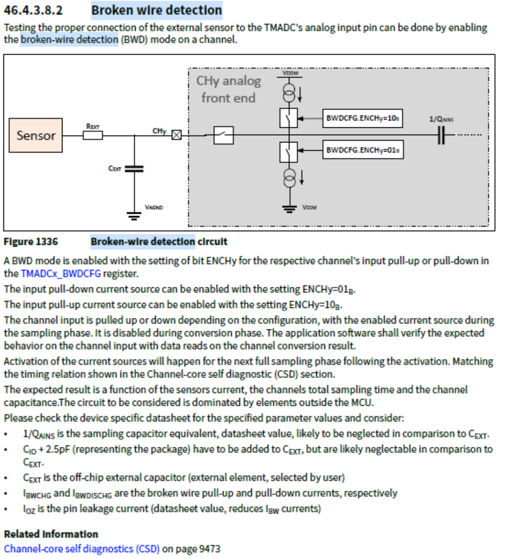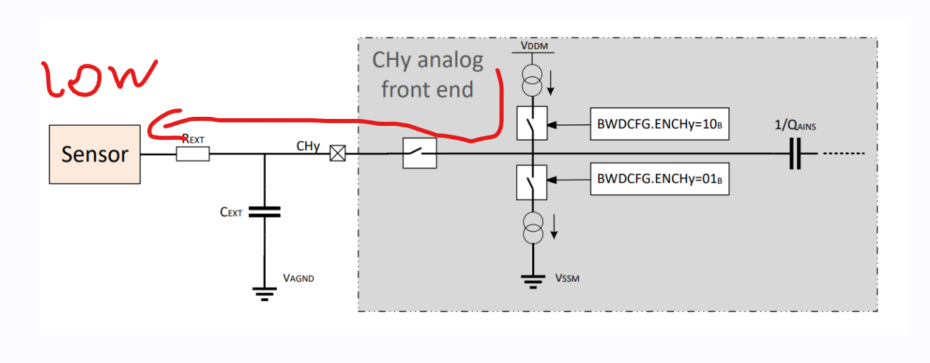 如果连接器仍处于连接状态,正常的ADC输出应接近地电位,尽管BWD PU上拉。这是因为外部传感器会覆盖掉内部的BWD PU。