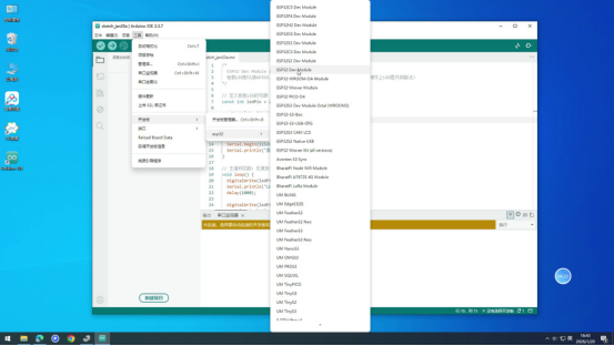 - 选择开发板:点击菜单栏"工具→开发板→ESP32 Arduino→ESP32 Dev Module",完成开发板型号选择。